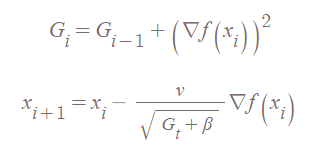 AdaGrad는 각각의 파라미터에 맞추어 값을 만들어줍니다. 신경망의 총 파라미터가 k개라고 하면, Gi는 k차원의 벡터입니다. 또한 i시점까지의 기울기 제곱의 합입니다. 그렇기 때문에 G값은 계속계속 커지겠죠? 따라서 아래의 파라미터 업데이트 수식에서 분모가 계속 커질것이고, 무한대로 간다면 학습률이 0으로 수렴하게 됩니다. 이렇게 된다면 정상적인 학습이 되지 않는다는 뜻이죠.