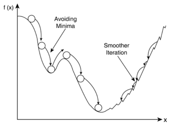 따라서 아래 그림처럼 local minimum 문제가 해결될 수 있겠죠! 공을 미끄럼틀에서 밀어버렸을 때, 미끄럼틀의 평평한 부분에 도달했다고 해서, 공이 멈추지 않는것처럼, 이 방법도 동일합니다.