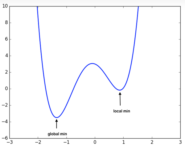 함수가 아래와같이 극소점이 여러 군데 존재하는 경우, 전체 그래프 내에서 극솟점을 Global minimum이라고 합니다. 추가적으로 실제로 얻고 싶은 값은 global minimum인데, local minimum에 빠져서 헤어나오지 못하는 경우를 local minimum문제라고 합니다.