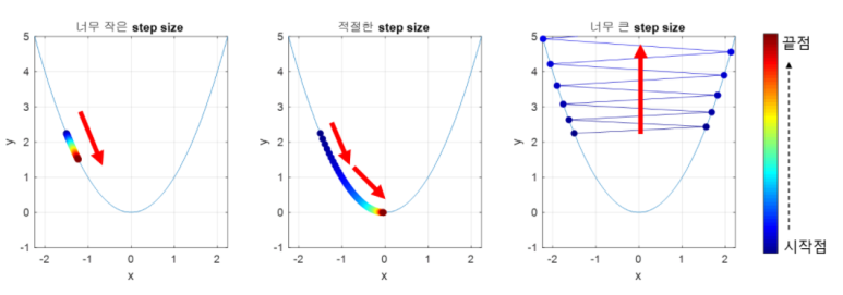 learning rate를 다시 한번 정리하자면, 얼마나 빠른속도로 이동할것이냐! 입니다. 만약에 learning rate를 엄청 크게 설정한다면, 원하는 값까지 빠르게 도달할 수 있습니다. 하지만, 자칫하면 오히려 최소값을 계산하도록 수렴하지 못하고, 감수값이 계속 커지게 됩니다(발산하게 됩니다). 반면 너무 작은 경우는 시간이 매우 오래걸린다는 단점이 있습니다. 따라서 적절한 learning rate설정이 중요합니다.