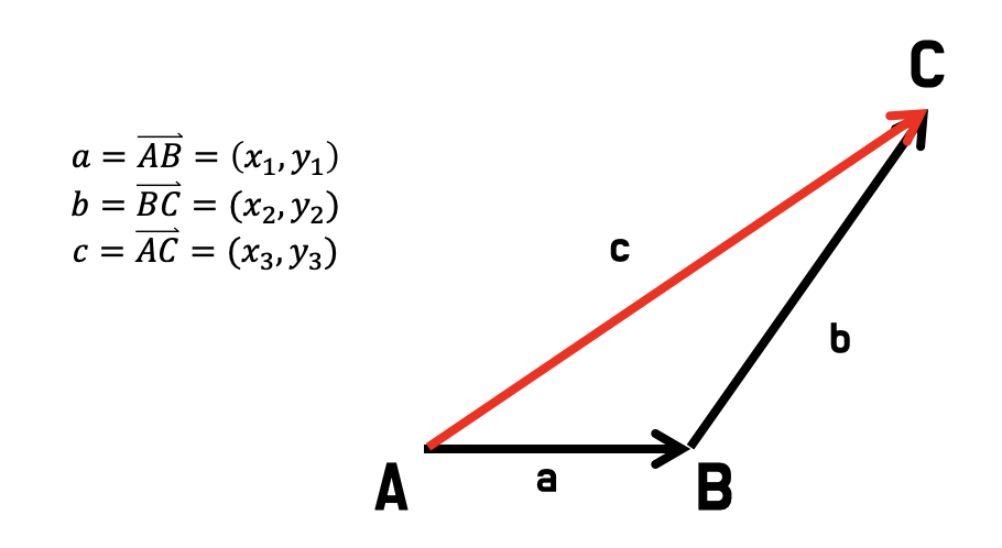(AB) + (BC) = (AC) 혹은 a + b = c로 나타낼 수 있고, 이를 성분으로 나타내면 c = a + b = (x1 + x2, y1 + y2) = (x3, y3)라고 할 수 있습니다.