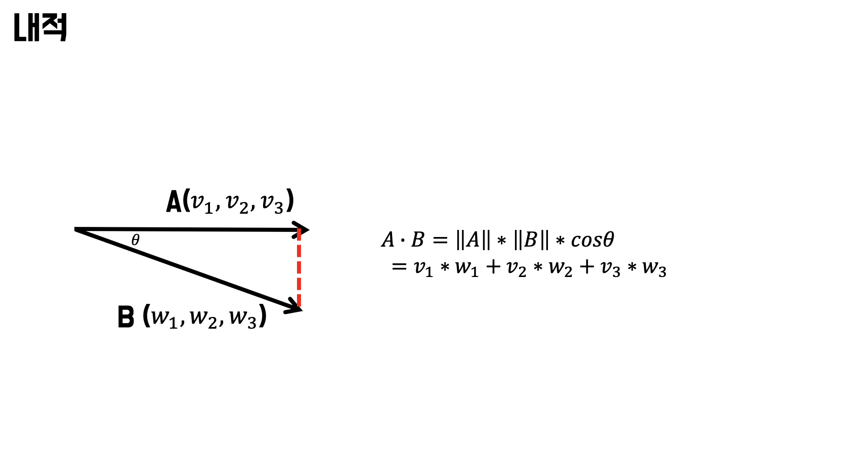 내적은 벡터를 수 처럼 곱합니다. 즉, 결과값이 스칼라로 나옵니다.