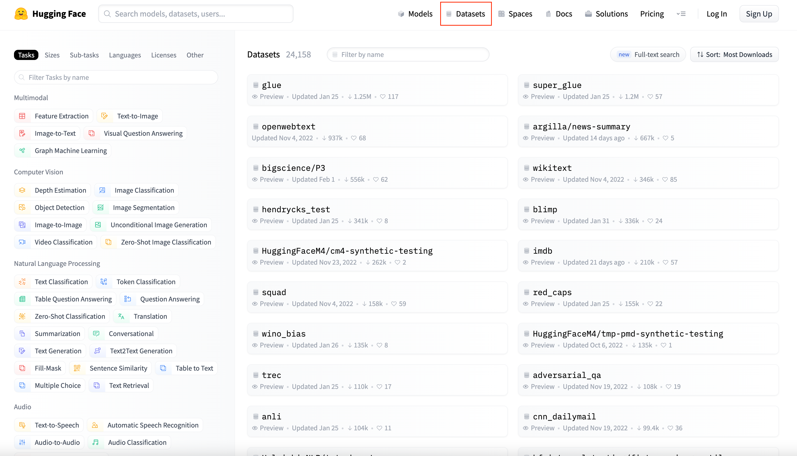 이번에는 Datasets을 누르시면 많은 데이터들이 검색됩니다.