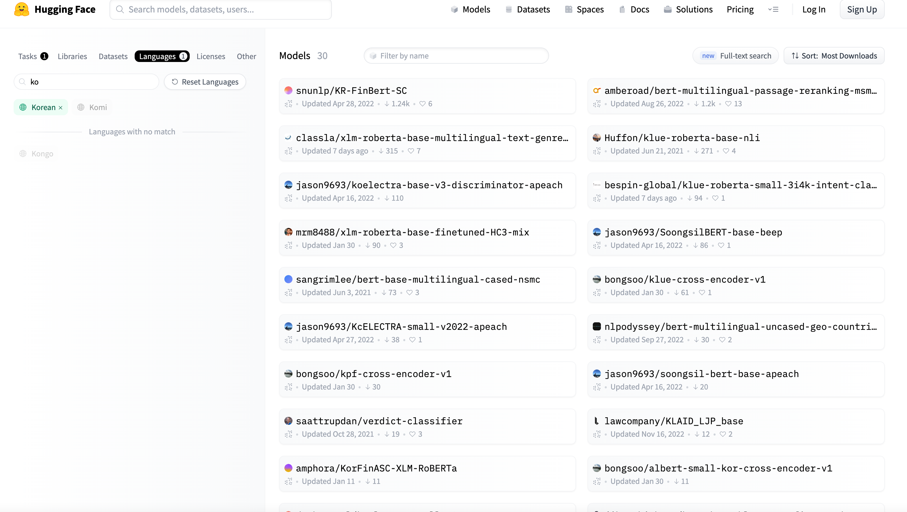 좌측 Tasks에서 Text Classification을 누르고, language에서 korean을 선택해 주면 그에 맞는 모델들이 검색되죠.