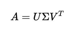특이값 분해는 원본 행렬인 A를 좌측 특이벡터 U, 특이값 행렬 Σ, 특이 벡터 행렬 𝑉^𝑇으로 나눕니다.