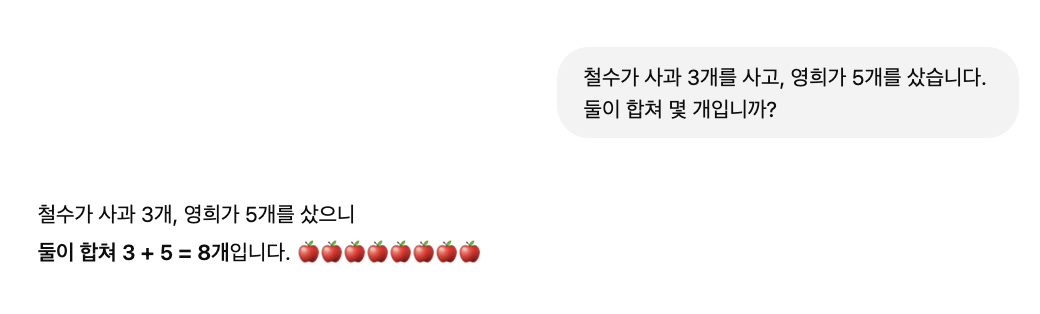 | 철수가 사과 3개를 사고, 영희가 5개를 샀습니다. 둘이 합쳐 몇 개입니까? |